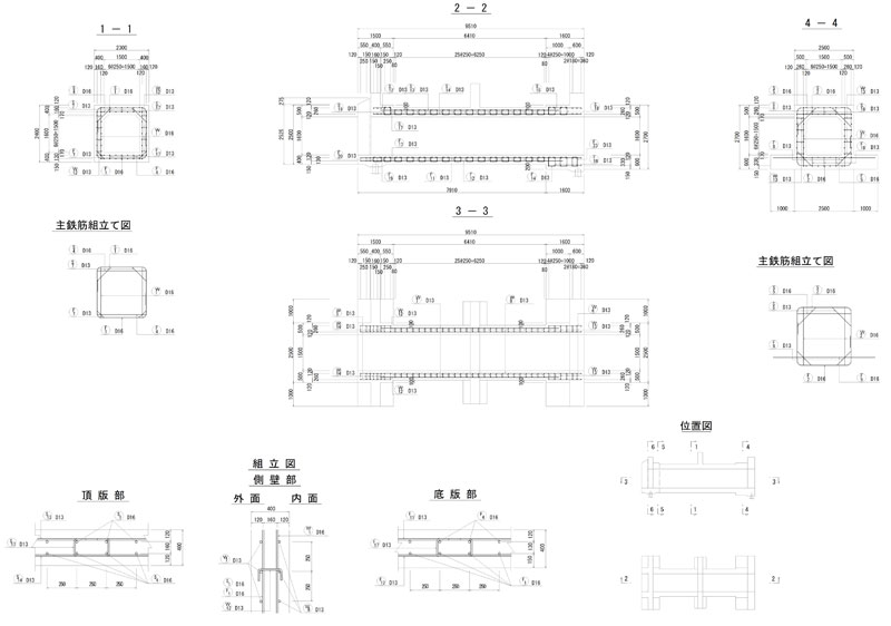 擁壁等の構造物では、コンクリート構造(RC構造)となるため、計算ソフトで躯体形状寸法や構造物の配筋状態を計算で求めた後、下記に示すように配筋を作成します。