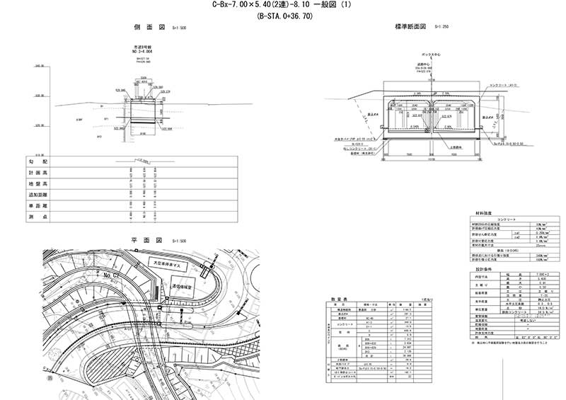 当社では、道路設計について、NEXCOの詳細設計を主に行っています。 詳細設計の内 容としては、道路詳細設計・連絡等施設設計・擁壁工設計・附帯工設計・工事用道路 設計等を行っています。 これら道路施設等に対して、道路線形の検討やインターチェンジの設計ならびに道路 を作る上での工事用道路の設計業務を行っています。