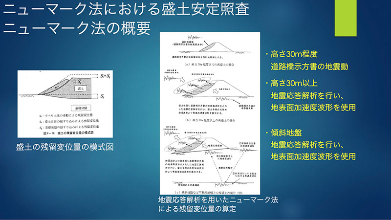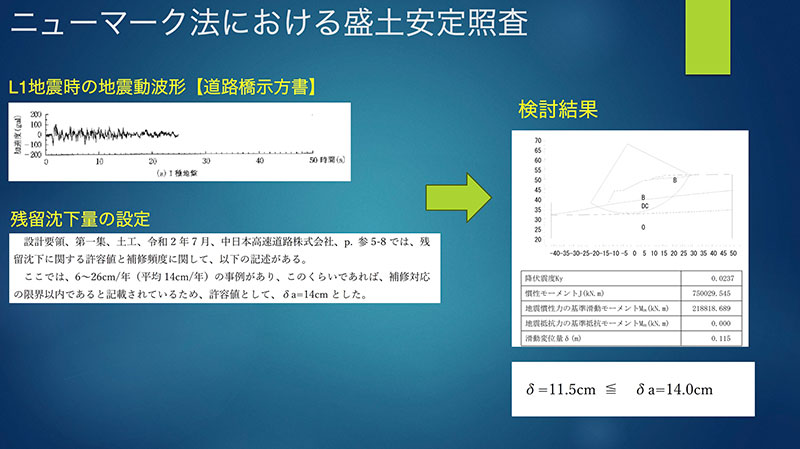 法面施設においては、極限平衡法に基づいた円弧すべり法を用いて、斜面安定解析を行っています。 当社では、通常の円弧すべり法も行いますが、NEXCO設計要領に記載されている15m以上の斜面の安定計算に用いる、レベル2地震時に対応したニューマーク法での解析も行っています。