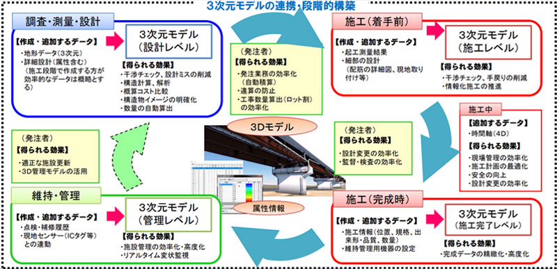 当社では、調査・計画・設計段階からBIM/CIM(Building / Construction Information Modeling, Management)モデルを導入し、その後の施工、維持管理の各段階においても、情報を充実させながら活用しています。