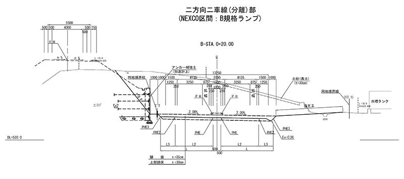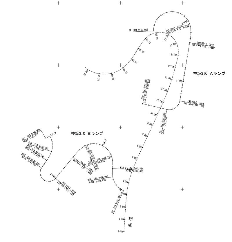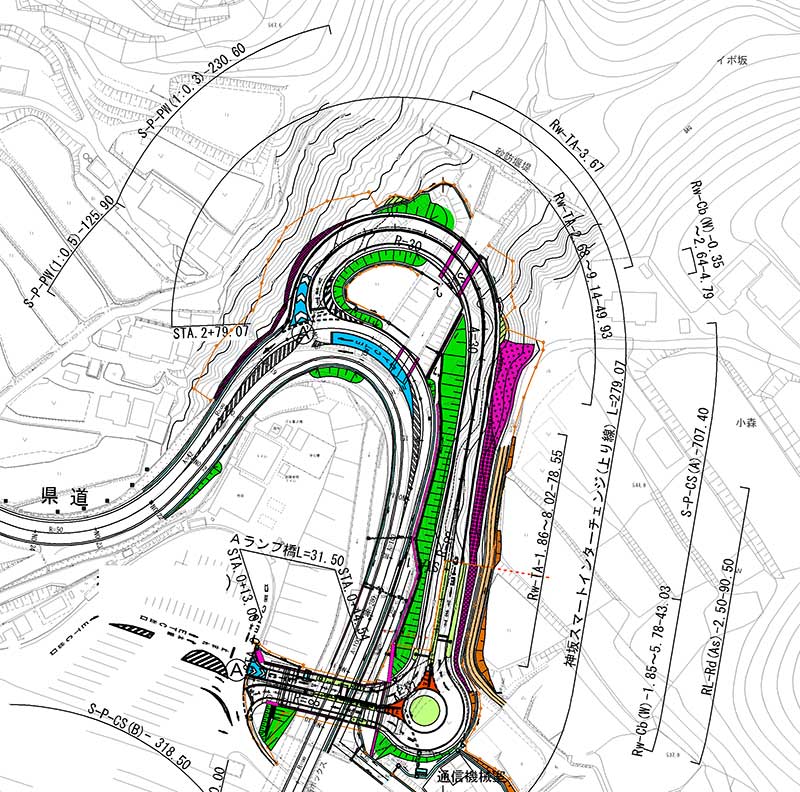当社では、道路設計について、NEXCOの詳細設計を主に行っています。 詳細設計の内 容としては、道路詳細設計・連絡等施設設計・擁壁工設計・附帯工設計・工事用道路 設計等を行っています。 これら道路施設等に対して、道路線形の検討やインターチェンジの設計ならびに道路 を作る上での工事用道路の設計業務を行っています。