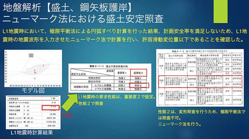 法面施設においては、極限平衡法に基づいた円弧すべり法を用いて、斜面安定解析を行っています。 当社では、通常の円弧すべり法も行いますが、NEXCO設計要領に記載されている15m以上の斜面の安定計算に用いる、レベル2地震時に対応したニューマーク法での解析も行っています。